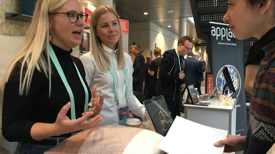 Emilie Bruun Poulsen and Marie-Louise Reade Lomholt were business talking with by passers about Novaheim at CBS Entrepreneurial Day 28th September. Now, they have signed up for a research project as well. (Photo: Anne M. Lykkegaard)